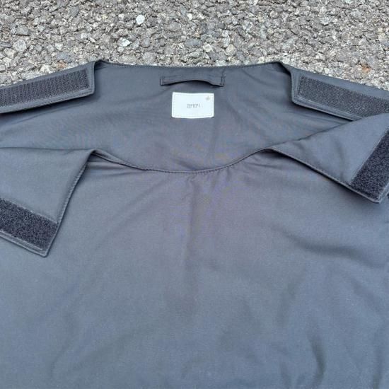 両方部、両脇部にある面ファスナーにより着丈で約2cm、身幅は約4cmの